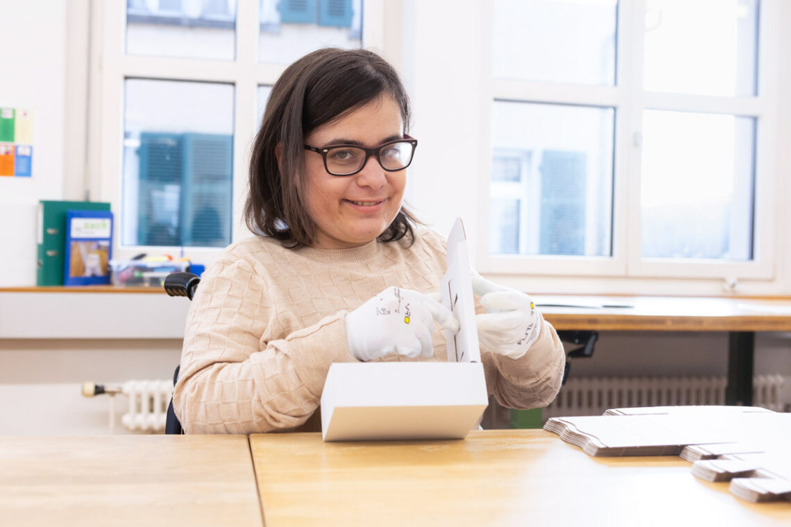 Regelmässig besucht die junge Frau – zusätzlich zur Musikstunde und zur Physiotherapie – betriebsintern eine Gruppenförderung. Dort trainieren die Klien-tinnen und Klienten gemeinsam mit Fachpersonen ihr schulisches Wissen. «Bei mir geht es im Moment ums Rechnen», sagt Amanda Bischof. Zahlen und zählen sind nämlich in ihrem Job sehr wichtig und entsprechen ihren Stärken. Geschnuppert hat sie zwar auch an anderen Orten, beispielsweise in einer Wäscherei. «Aber weil ich aufgrund meiner Behinderung sitzen muss, gelangte ich nicht an alle Arbeits-flächen und Geräte heran», erinnert sie sich. «Deshalb ist es für mich in der Industrie viel besser. Auch hier ist es wichtig, sorgfältig zu arbeiten – und das kann ich wirklich gut.»